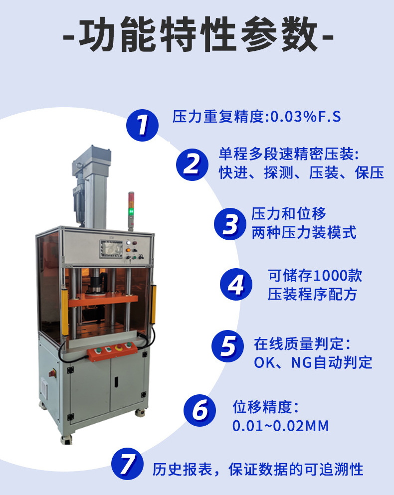 其工作原理是由伺服电机系统驱动,结合高精度滚珠丝杆进行压装配工艺作业,能够在装配作业中实现压力与深度全过程闭环控制,从而实现在线质量管理的精密压装。