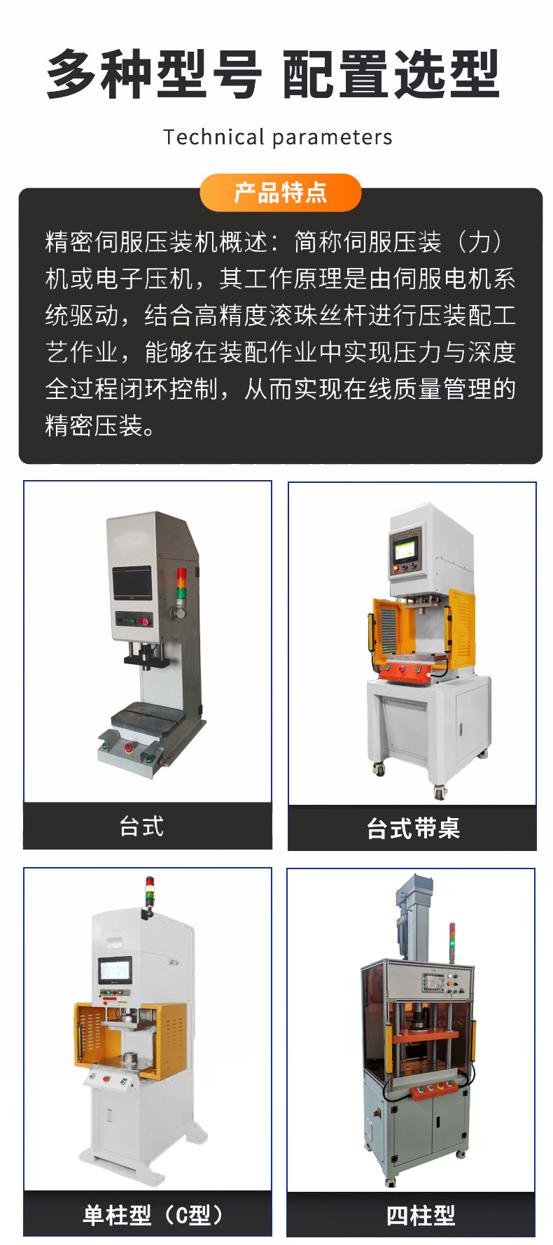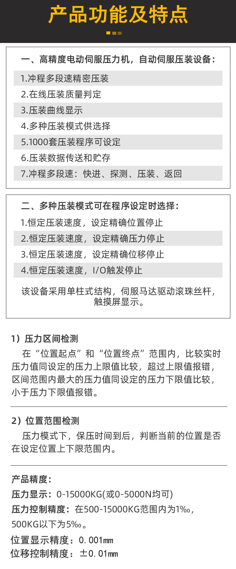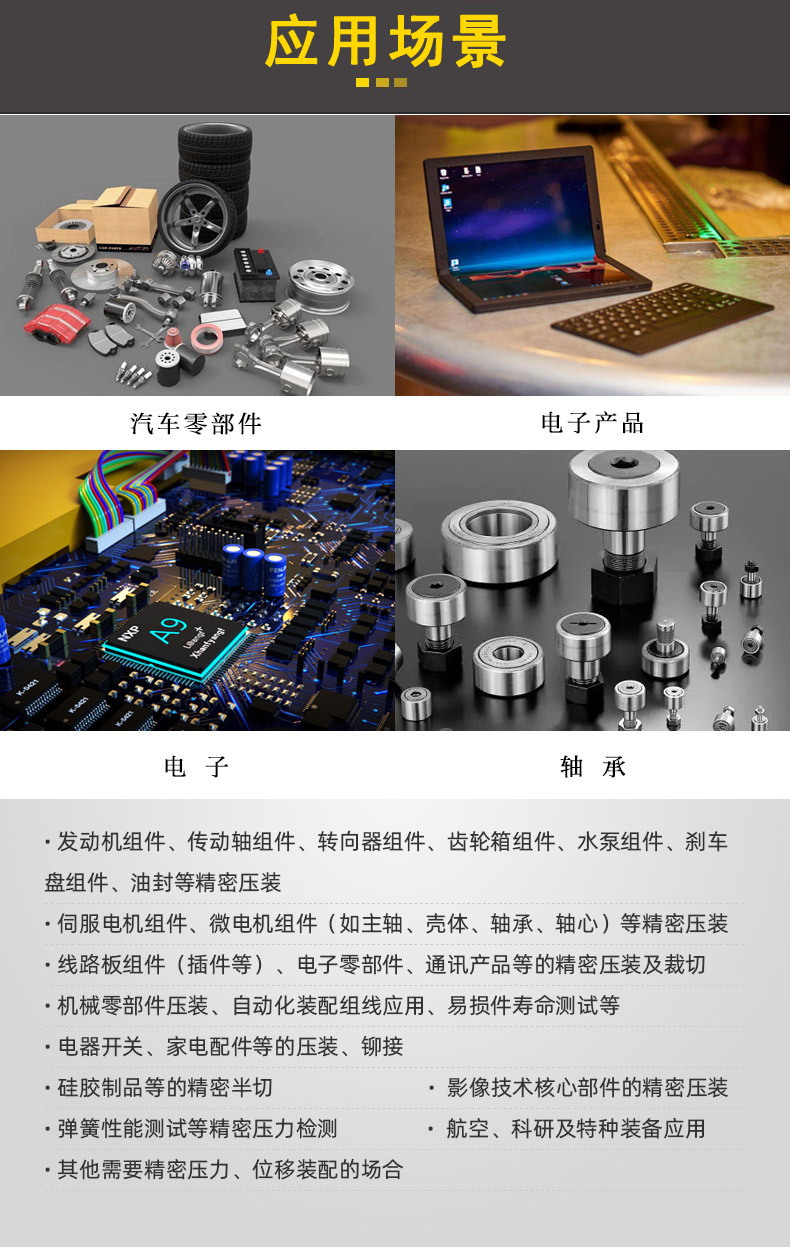 其工作原理是由伺服电机系统驱动,结合高精度滚珠丝杆进行压装配工艺作业,能够在装配作业中实现压力与深度全过程闭环控制,从而实现在线质量管理的精密压装。